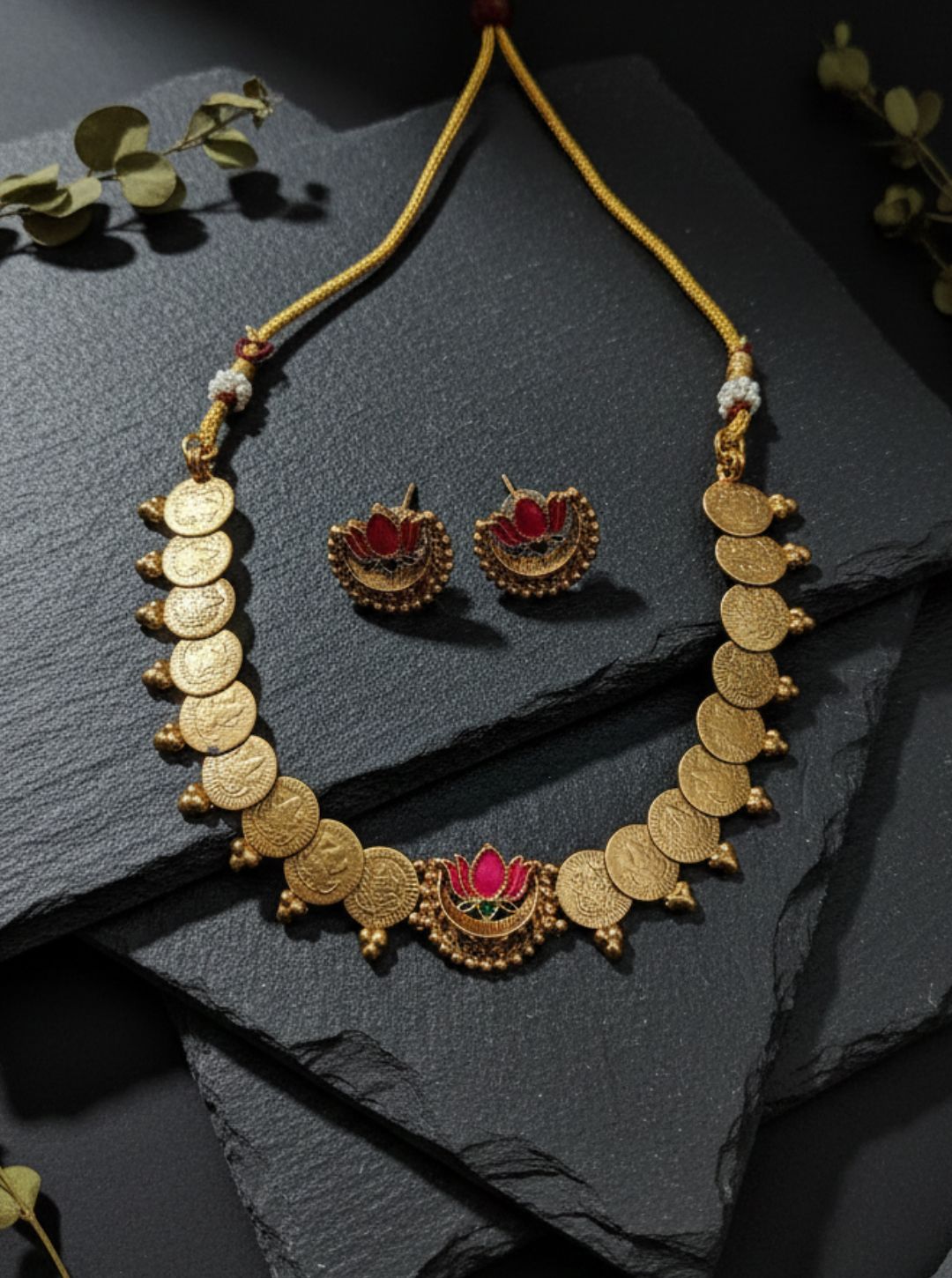 A heritage-inspired necklace set designed with rowed antique coin motifs and a central lotus emblem, reflecting timeless temple artistry.