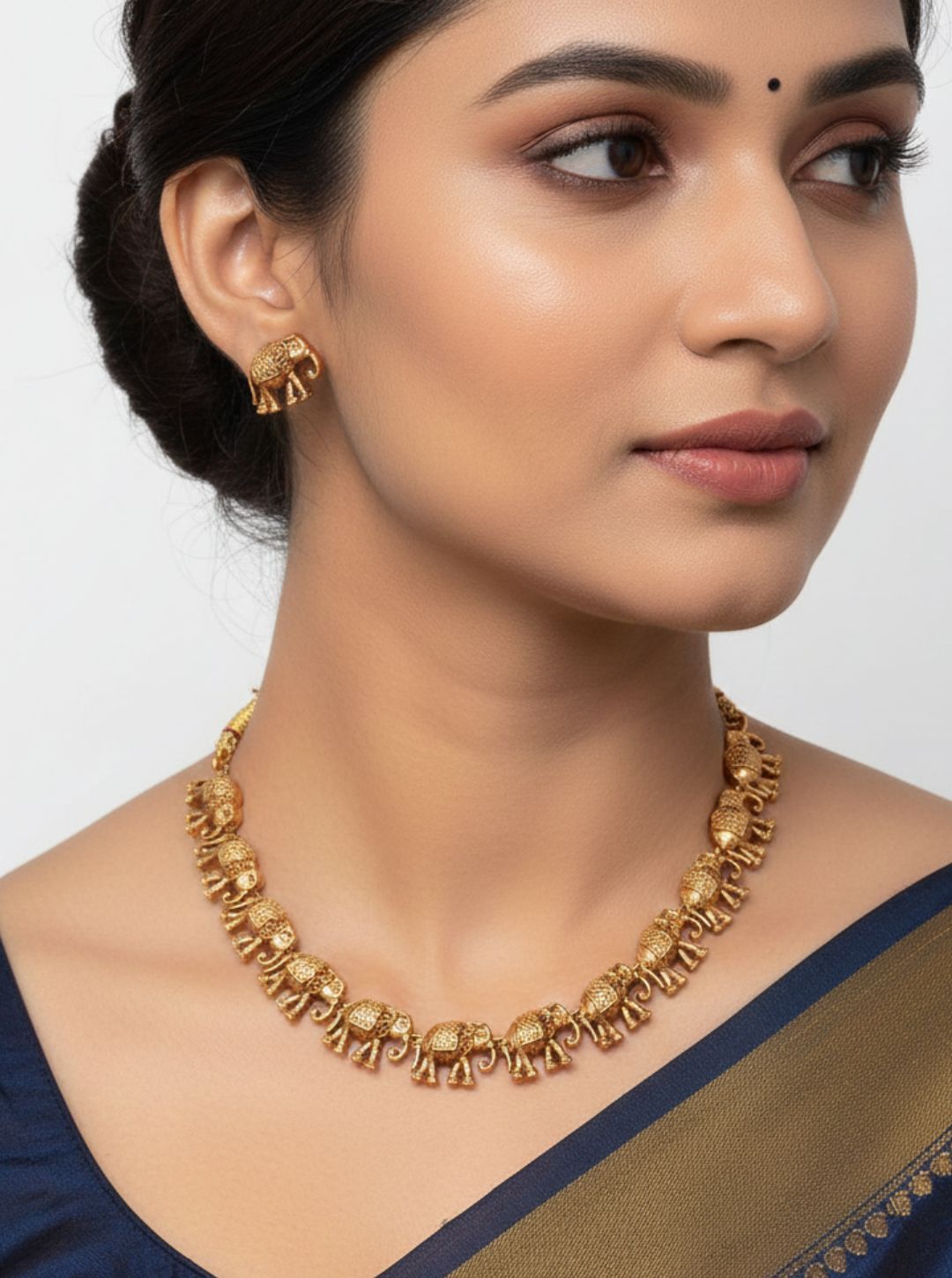 A bold temple-style necklace set crafted with rowed elephant motifs, symbolizing strength and heritage elegance.