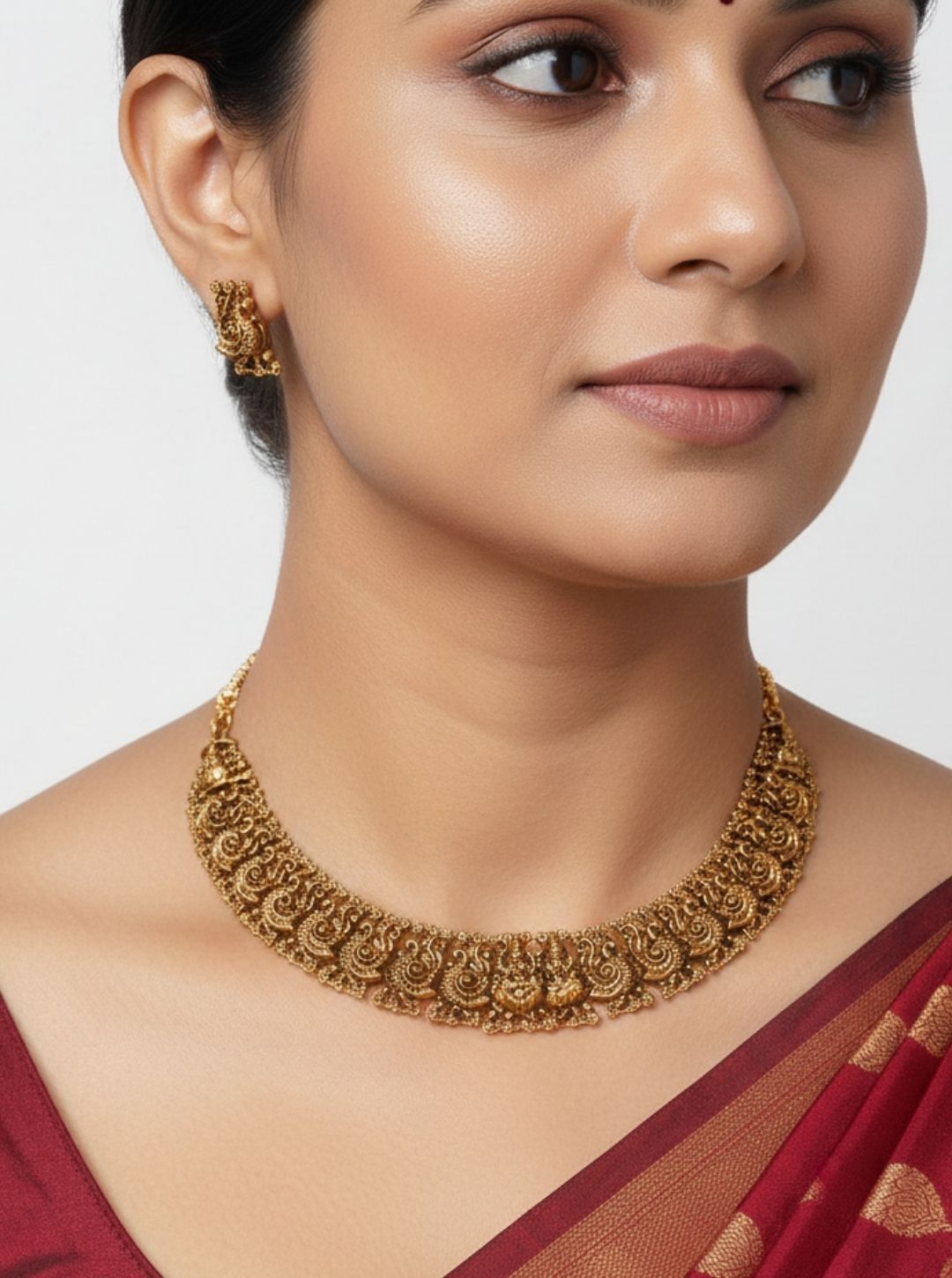 A heritage-inspired collar necklace showcasing intricate paisley engravings in an antique gold finish, reflecting timeless South Indian craftsmanship.