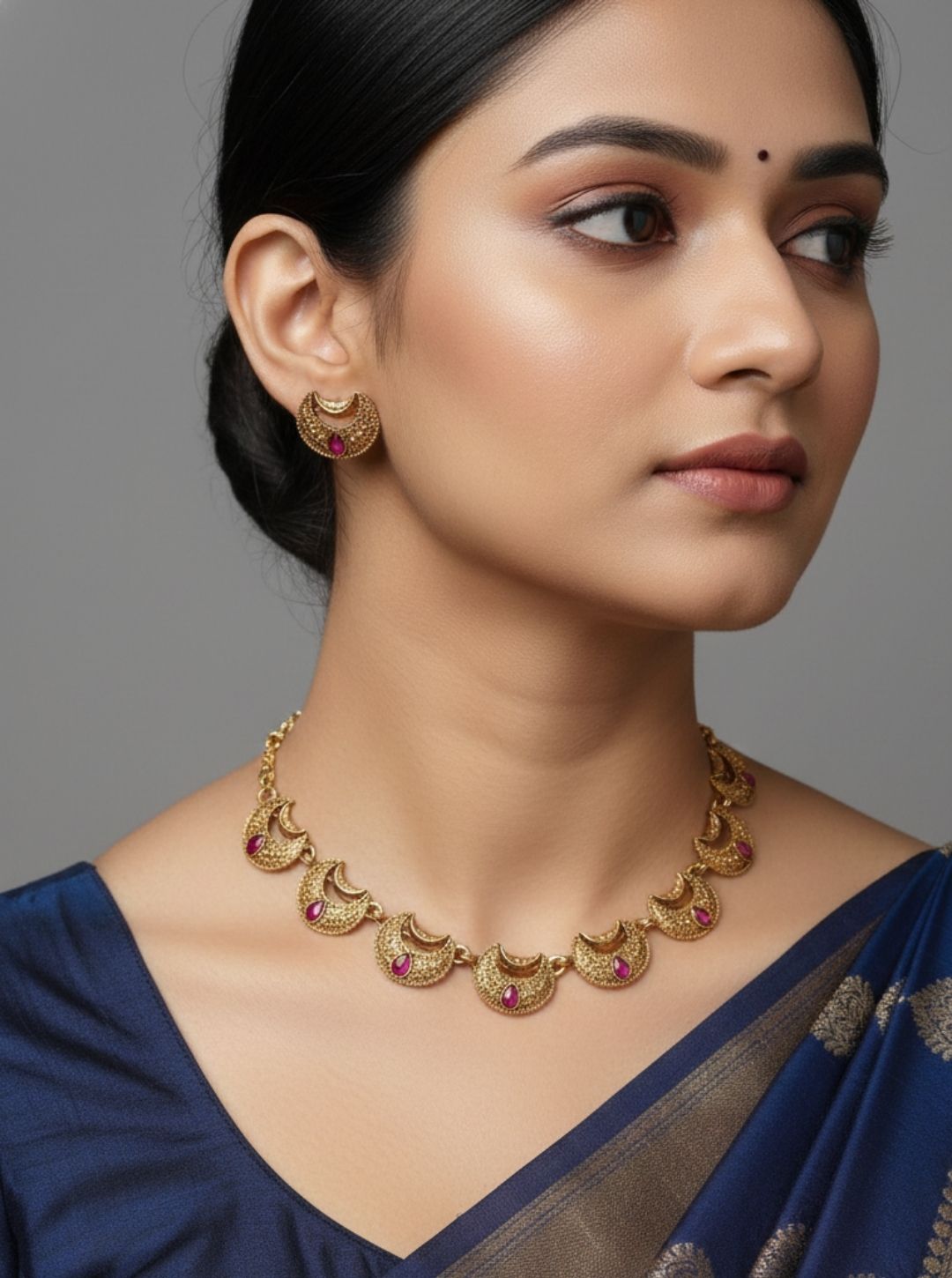 A striking temple necklace set designed with crescent moon motifs, highlighted by ruby red stones for bold traditional elegance.