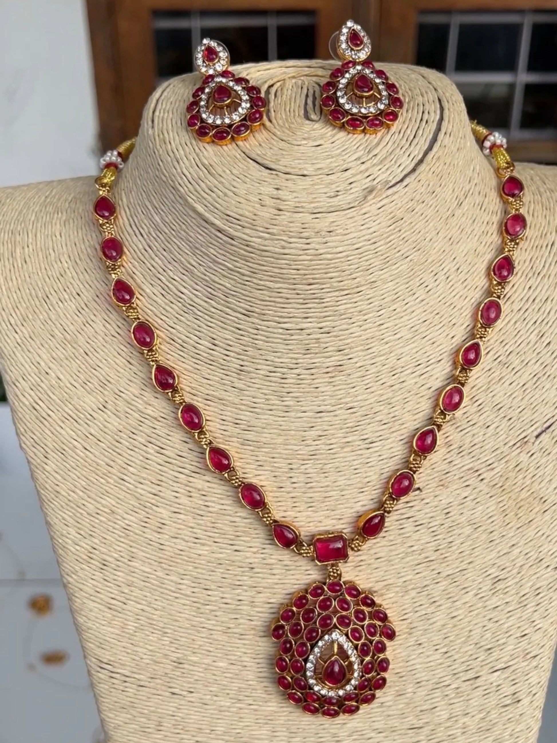 The necklace’s elegant design pairs perfectly with both traditional and modern outfits, making it ideal for weddings, festive occasions, or evening parties. Its lustrous finish and vibrant ruby hue add an irresistible charm to every look.