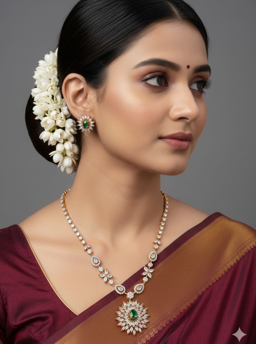An elegant diamond-inspired necklace with a sunflower-shaped ruby centerpiece, paired with sparkling matching earrings for a luxurious evening look.