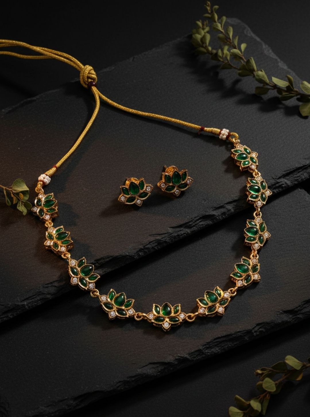 Leaf-inspired floral design with rich green stones