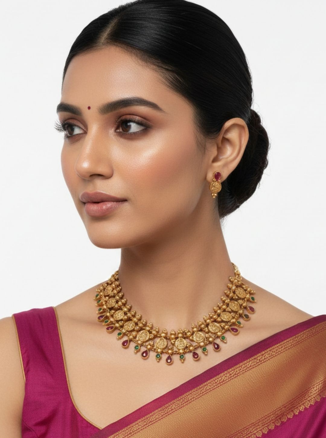 Paired with matching earrings, this necklace exudes timeless charm and is perfect for brides, festive occasions, and traditional celebrations. Its detailed craftsmanship and authentic South Indian design make it a must-have for every jewelry collection.