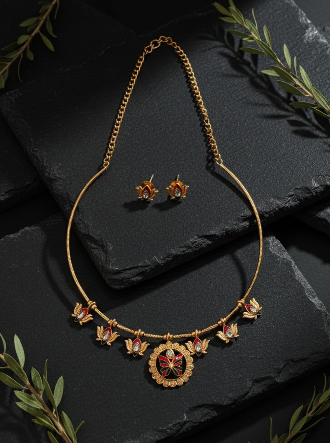 A delicate necklace set featuring a hand-enamelled lotus-inspired pendant, symbolising purity and grace with subtle stone accents.