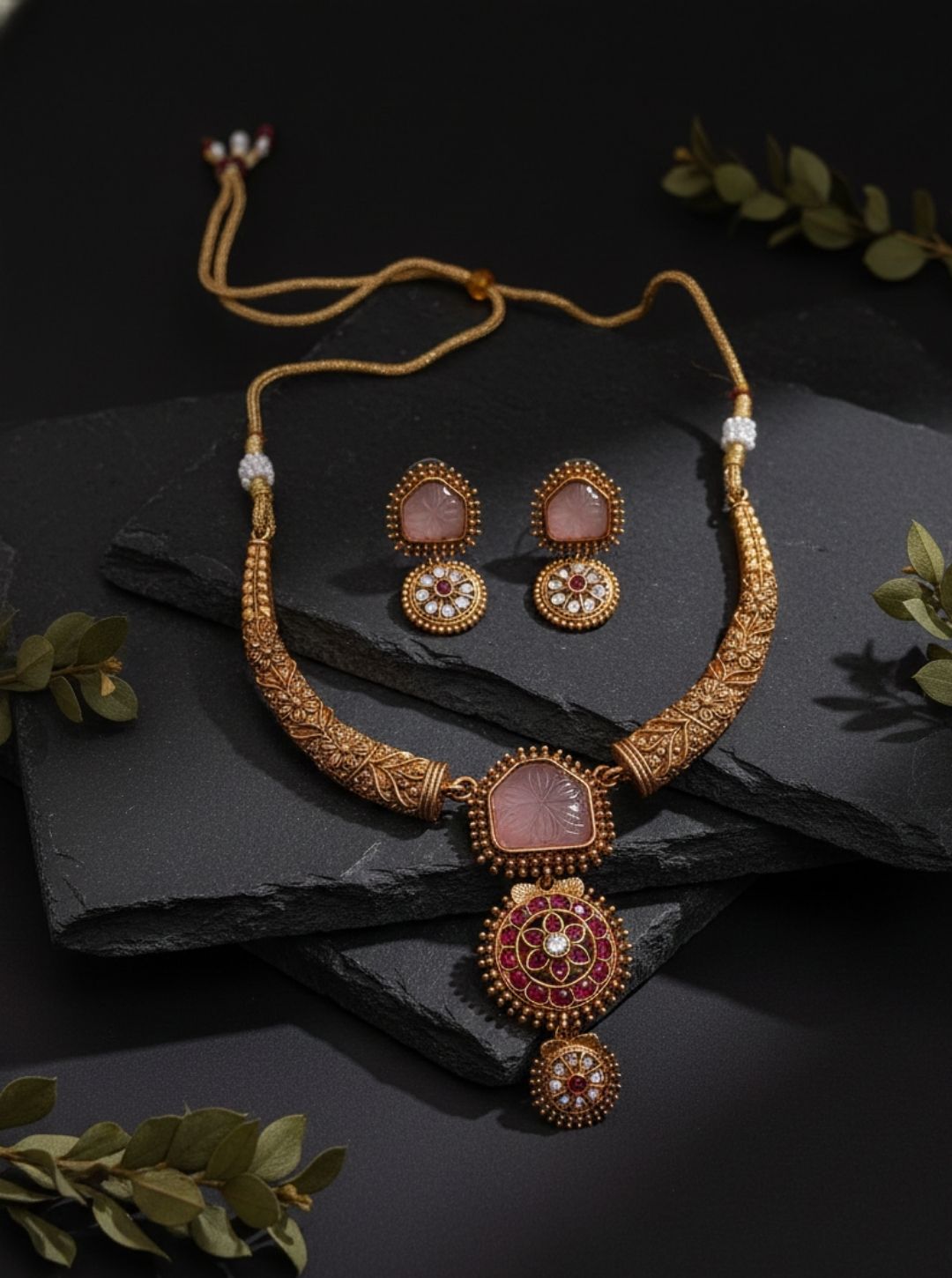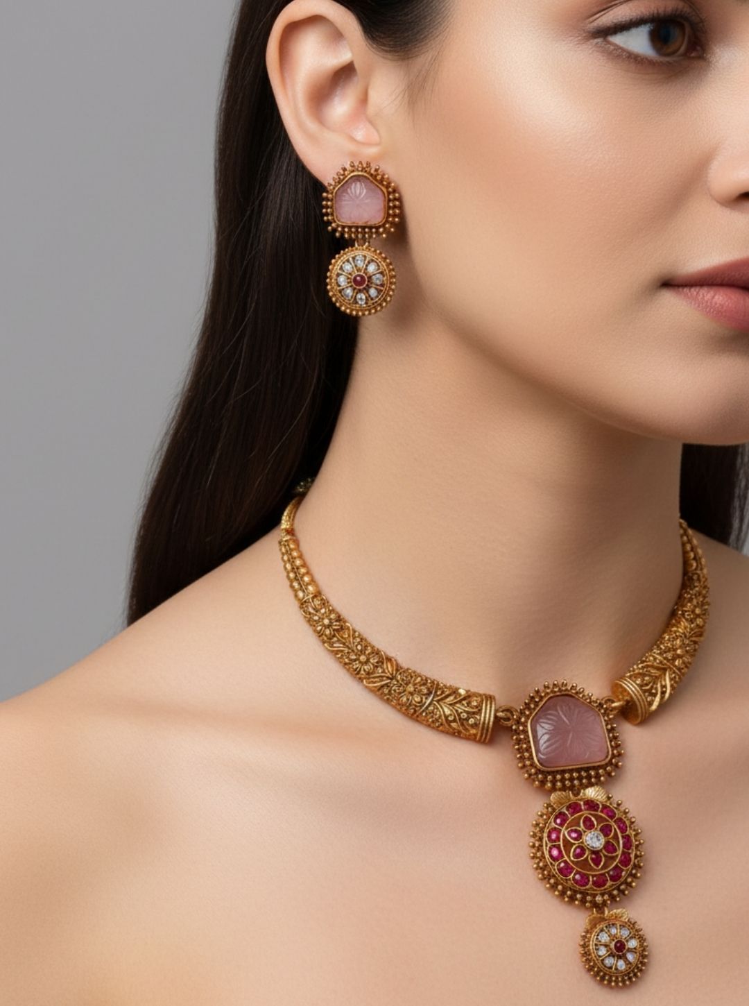 Embrace regal elegance with the Royal Monalisa Kanti Necklace Set, a masterpiece of craftsmanship and charm. This stunning design features two graceful color variants — mint green and pink Monalisa stones, offering a radiant yet soothing appeal.