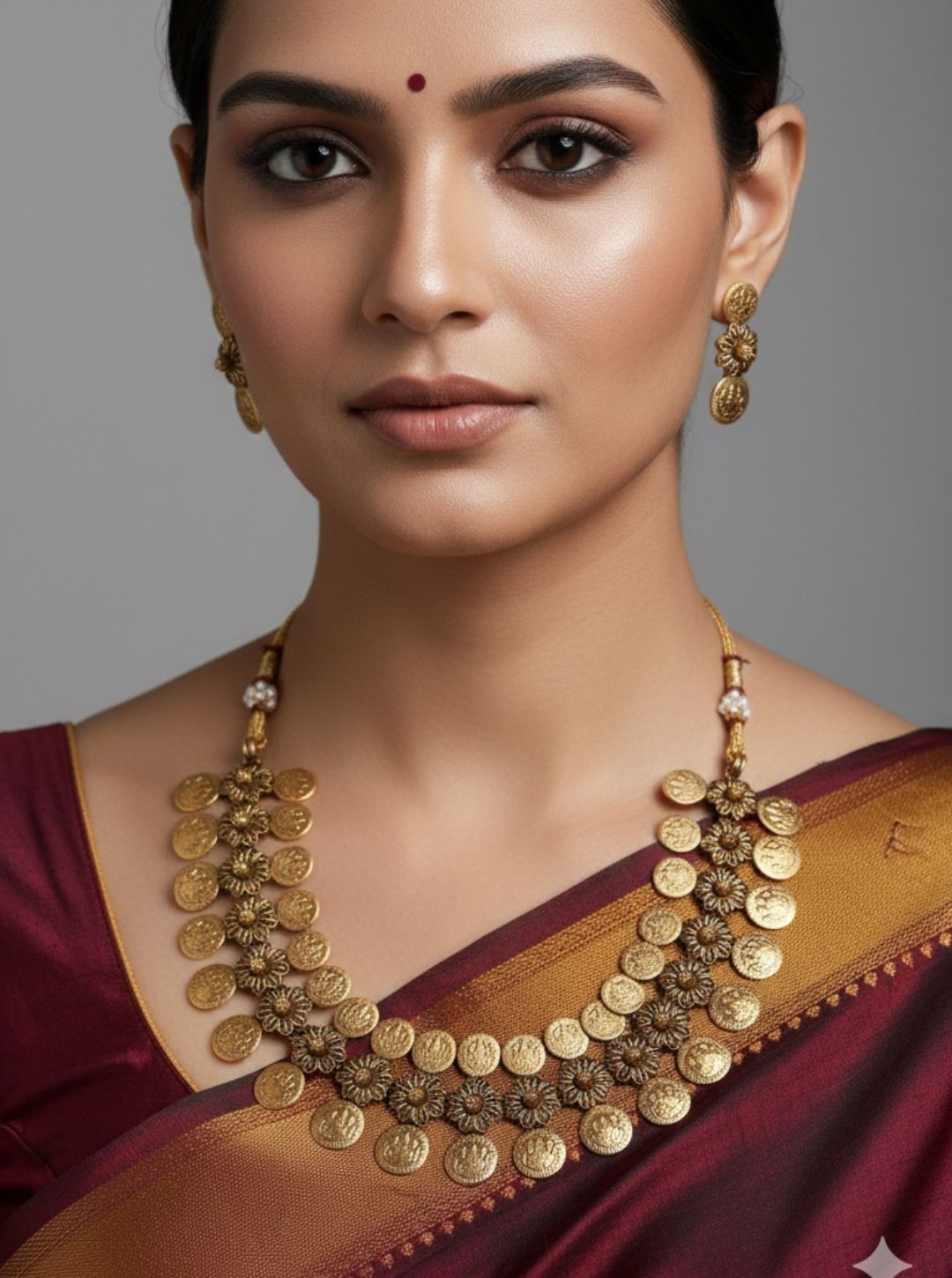 A refined temple-inspired necklace with embossed coin elements and subtle stone accents, paired with classic earrings.